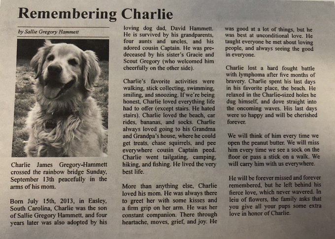 LAURYN OVERHULTZ: A South Carolina woman brought everyone to tears on Twitter after she wrote a heartwarming obituary for her dog, Charlie. Charlie was 7 years old at the time of his death and died from canine lymphoma, according to a Sept. 22 tweet shared by Sallie Hammett. The tweet recently went viral, and rightfully so.